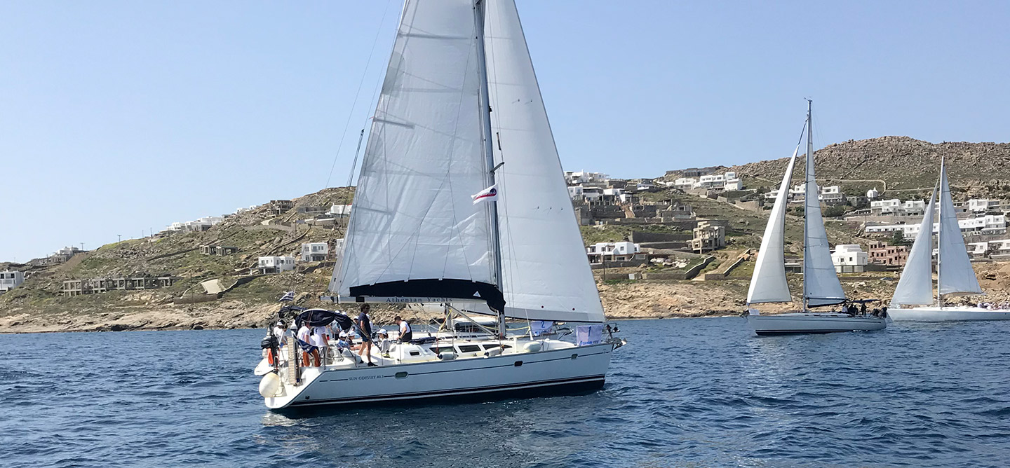 - Activity competitive sailing regatta by 16 sailing boats to Delos. Visit Delos – sailing towards – Rhenia island – Swimming time at Rhenia – Disembarkation at Elia Beach – Lunch – Transfers to hotel and Mykonos Town – Cocktail reception at the hotel – Gala Dinner with DJ and dance show at the hotel