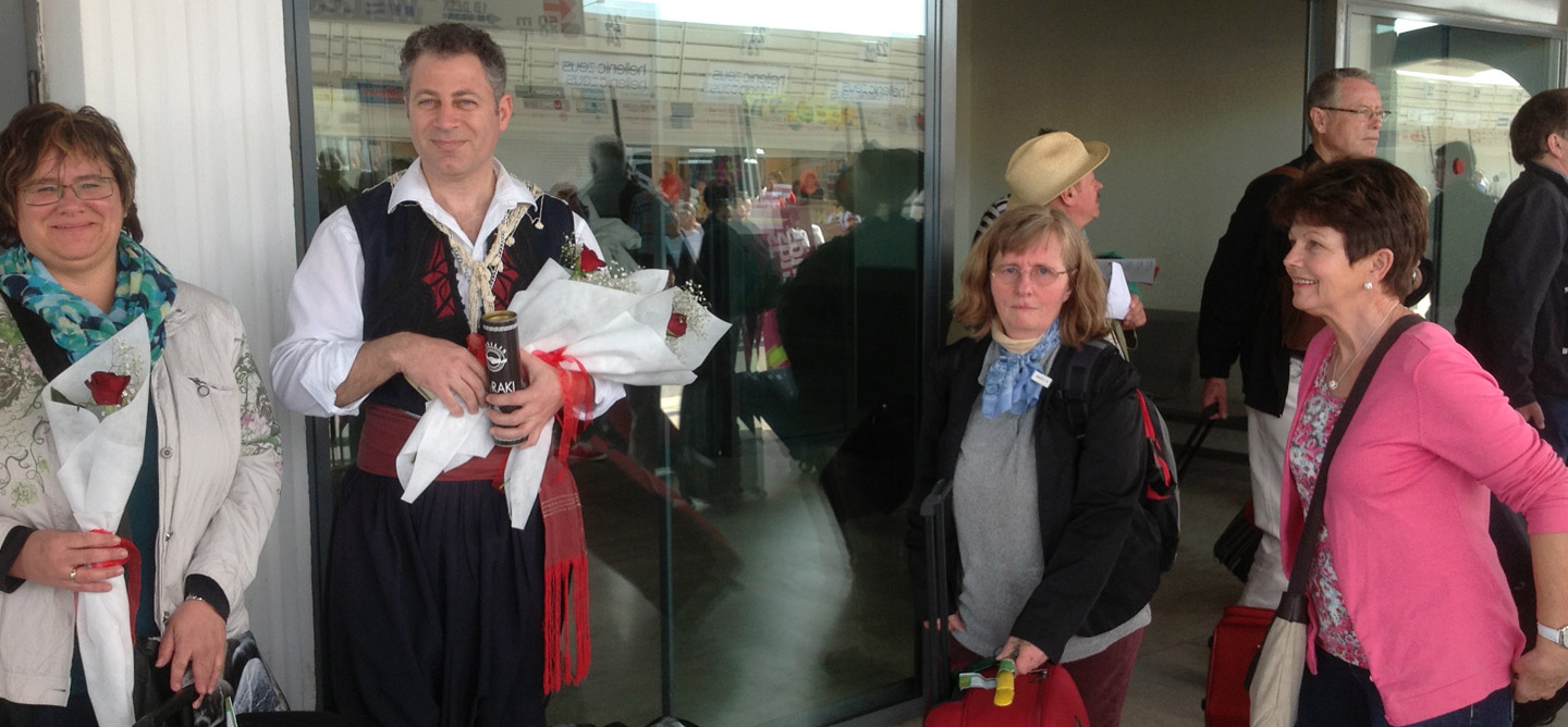 - Arrival transfer with Traditional Cretan man offering roses to ladies and bottle of raki to man.