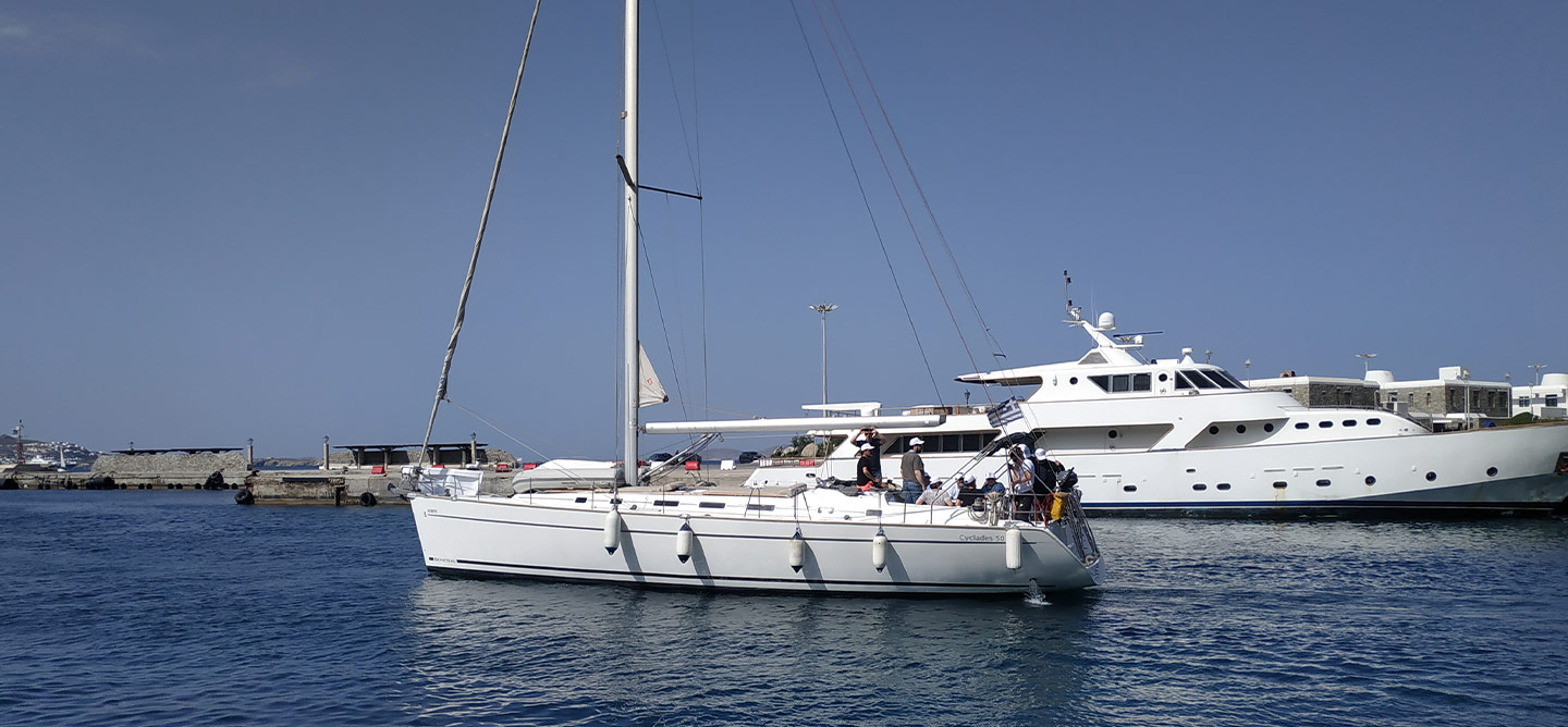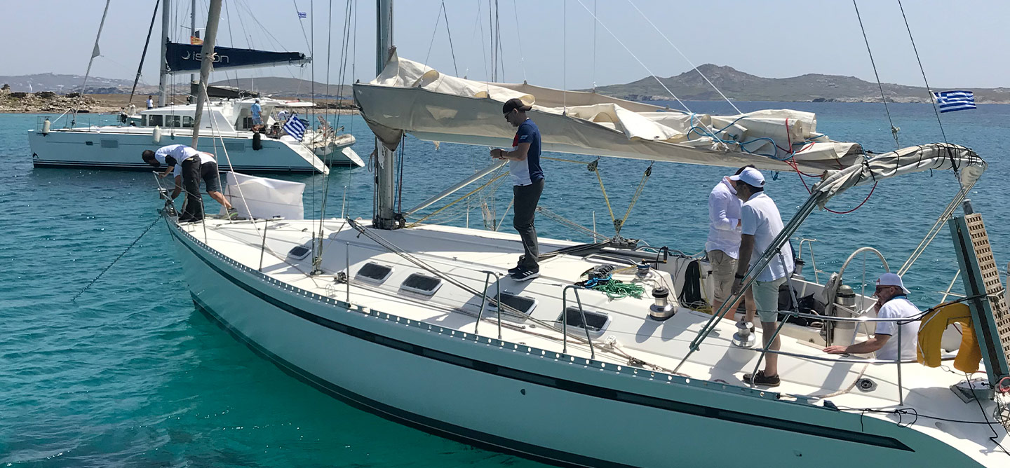 - Activity competitive sailing regatta by 16 sailing boats to Delos. Visit Delos – sailing towards – Rhenia island – Swimming time at Rhenia – Disembarkation at Elia Beach – Lunch – Transfers to hotel and Mykonos Town – Cocktail reception at the hotel – Gala Dinner with DJ and dance show at the hotel